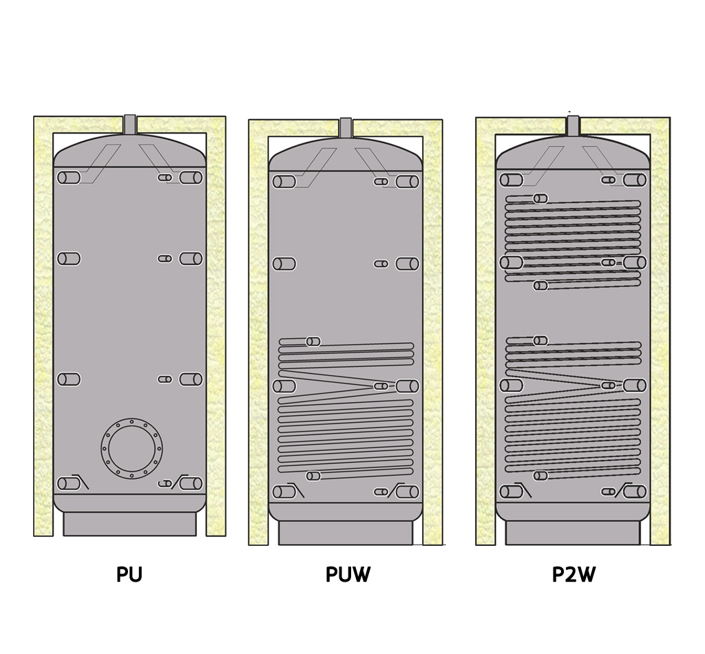 Depósitos de inércia construídos em chapa de aço para água de primário em instalações de aquecimento.