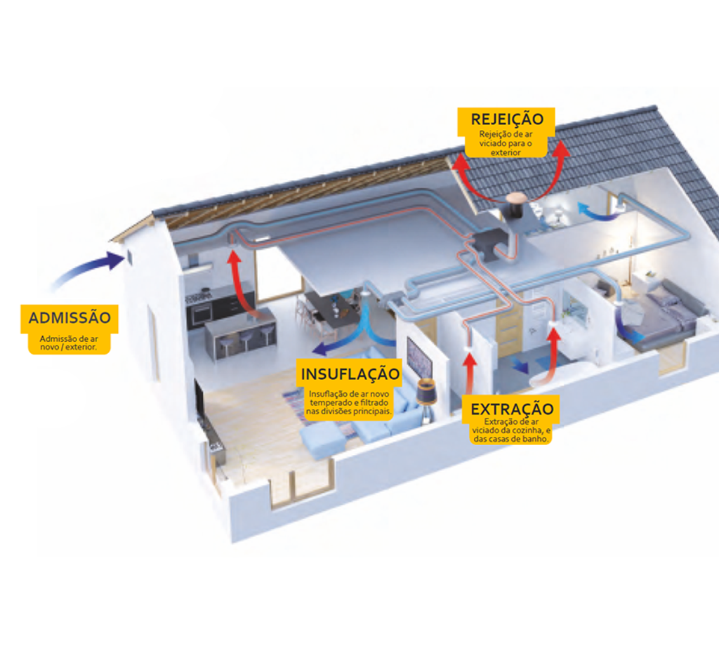 O VMC Duplo Fluxo é um sistema mecânico de extração e insuflação de ar com permuta térmica entre o ar viciado e o ar novo. O ar viciado é extraído pelas grelhas localizadas na cozinha e nas casas de banho, e o ar novo é insuflado através das grelhas localizadas nos quartos e na sala. O ar novo não se mistura com o ar viciado, mas recupera energia passando pelo permutador de calor no qual os dois fluxos se cruzam. Depois de temperado, este ar higienizado é difundido nas divisões principais pelas grelhas de insuflação através da caixa de distribuição.
